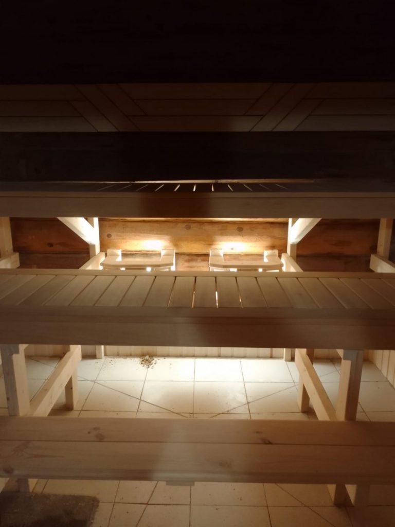 Главная особенность — многослойный дизайн, использующий различные типы отделки. В парной установлена сложная система освещения: авторский потолок со спилами дерева и скрытой подсветкой (наша визитная карточка), дополненный вертикальными светящимися элементами (возможно, из натурального камня или полимерного оникса) вдоль углов. Полки выполнены из термостойких пород дерева и оборудованы скрытой подсветкой по периметру.