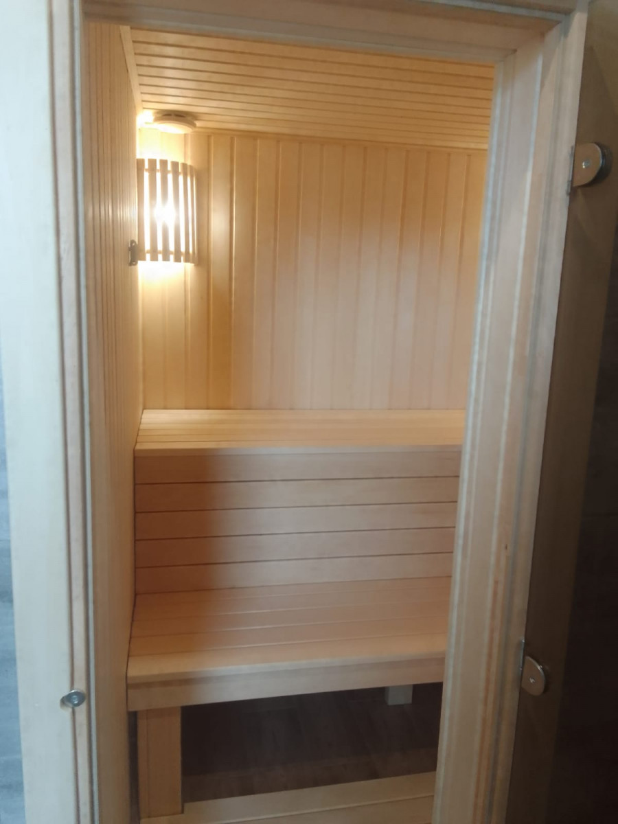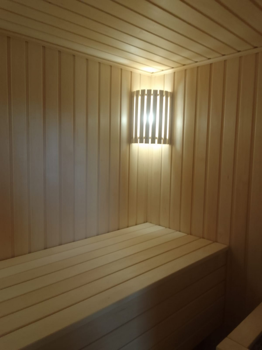 Для получения идеального пара установлена современная печь-сетка с большим объемом камней, что гарантирует мягкий и стабильный жар. Печь защищена элегантным деревянным ограждением и установлена на фоне защитной стены, облицованной натуральным камнем, который выдерживает высокие температуры и служит дополнительным тепловым аккумулятором.