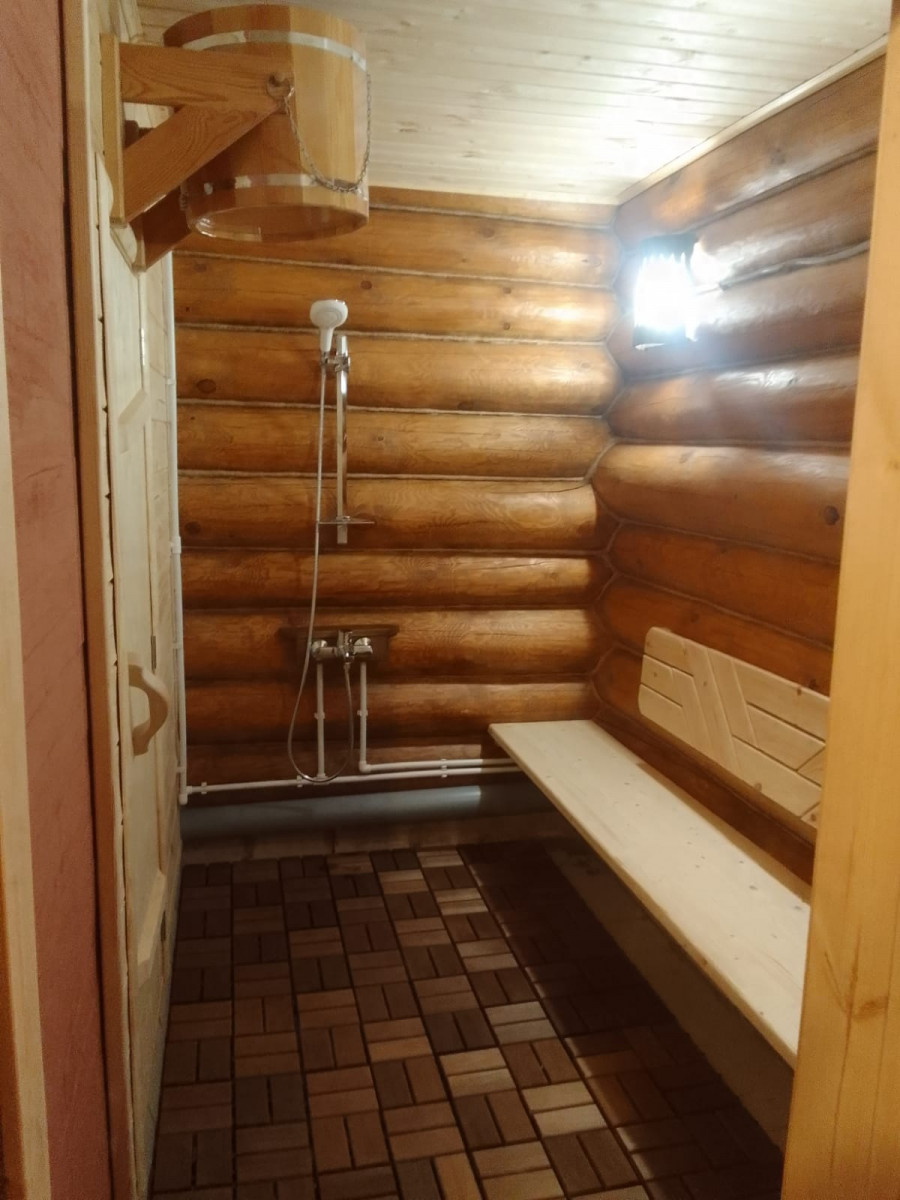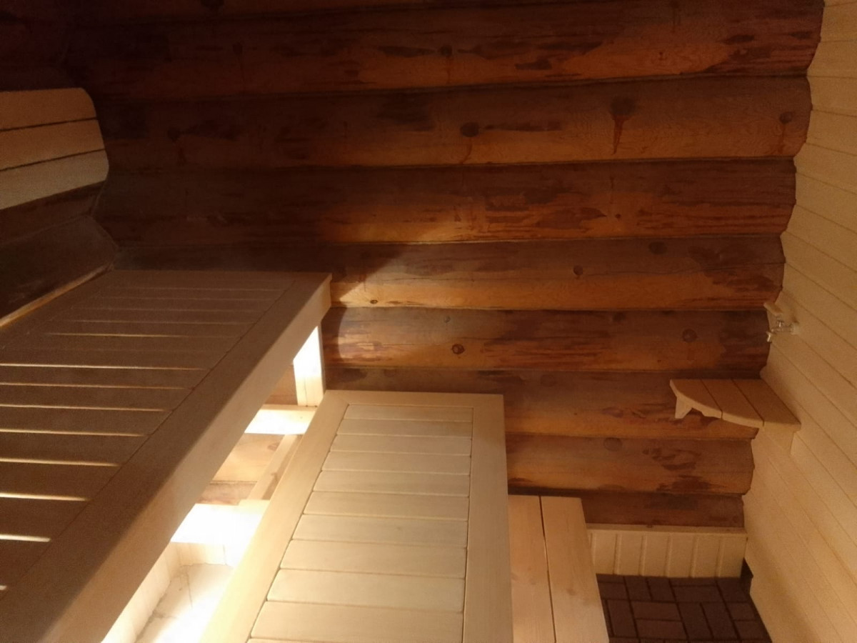 В предбаннике и зоне отдыха была проведена реконструкция с сохранением или имитацией стены из натурального бревна (сруба), что создает теплый, традиционный акцент. При этом смежные стены обшиты светлой вагонкой из специальных пород дерева, что обеспечило гладкий переход и отличную теплоизоляцию. Мы успешно решили задачу интеграции новой современной парной в существующий деревянный сруб.