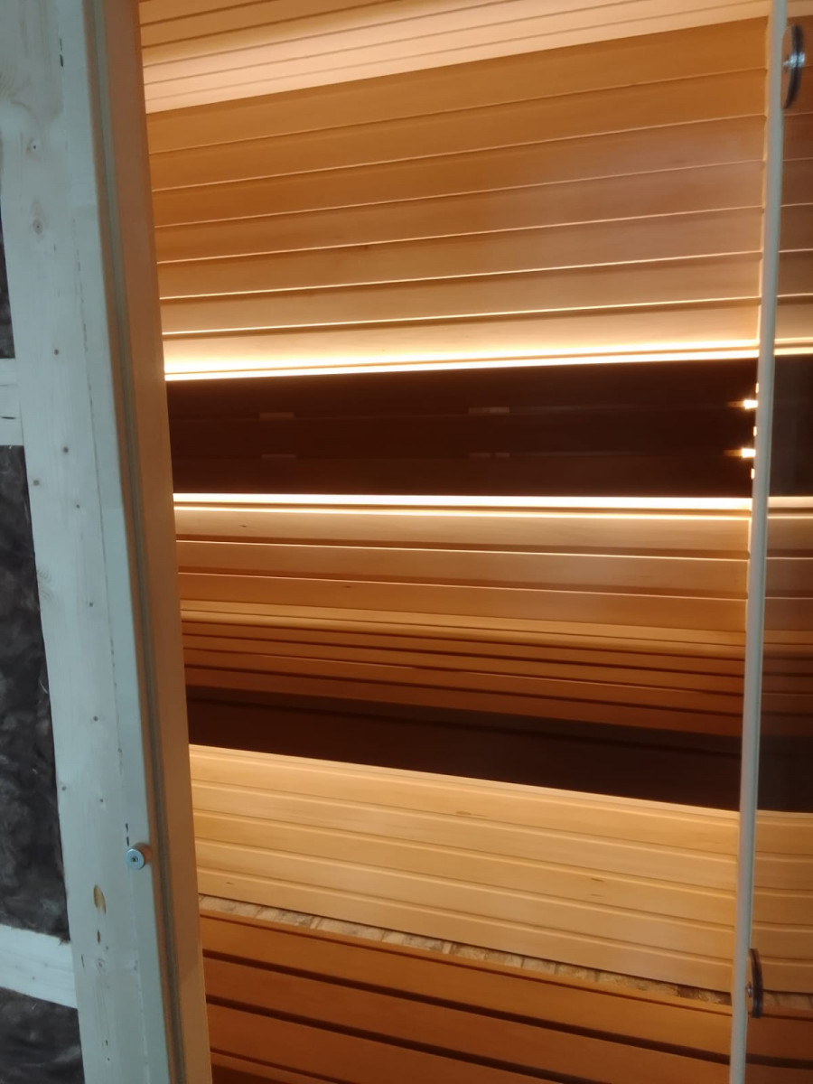 Для отделки использованы специальные породы дерева для саун (светлая вагонка), обеспечивающие комфортную температуру поверхности. В этом проекте мы применили многоуровневую систему полоков и спинок, под которыми интегрирована мягкая, скрытая LED-подсветка. Этот свет не только создает расслабляющую атмосферу, но и служит важным элементом безопасности.